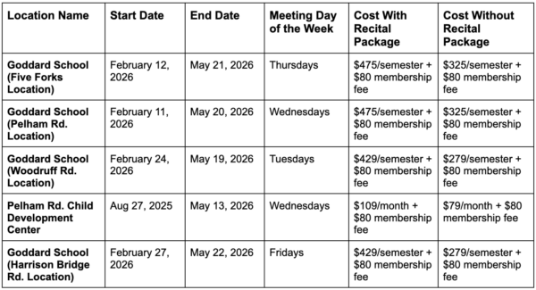 You will enroll for the class directly through DWL and pay a monthly tuition fee to the studio. The class details vary by school location. Please refer to the chart below for specifics.